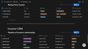 Live Dashboard — automated overview of pipeline stages, valuation updates, and task assignments.