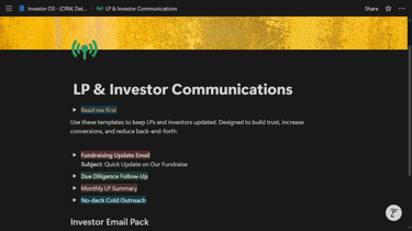 Investor Comms Pack — templated LP reports and email scripts pre-linked to data rooms.
